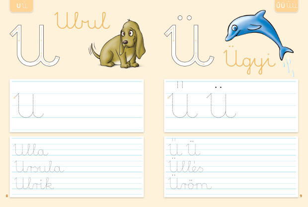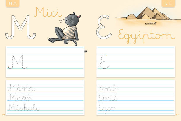 Az írott nagybetűk nagy méretű vázolásával, a vonalvezetés irányának jelölésével könnyíti meg az írástanulást.