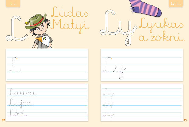 A tanult betű kapcsolási módozataira rövid szavakat ad mintaként. Ezeket átírással, majd másolással gyakorolhatják a gyerekek megnövelt méretű vonalrendszerben.